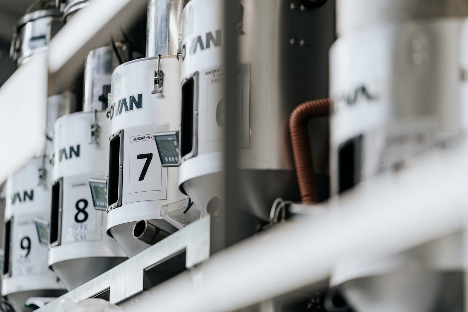Automated production stations are equipped with part handling manipulators, conveyor belts and material preparation systems. The plastic granulate is carefully dried before being fed into the machine, ensuring consistent processing parameters and stable product quality.